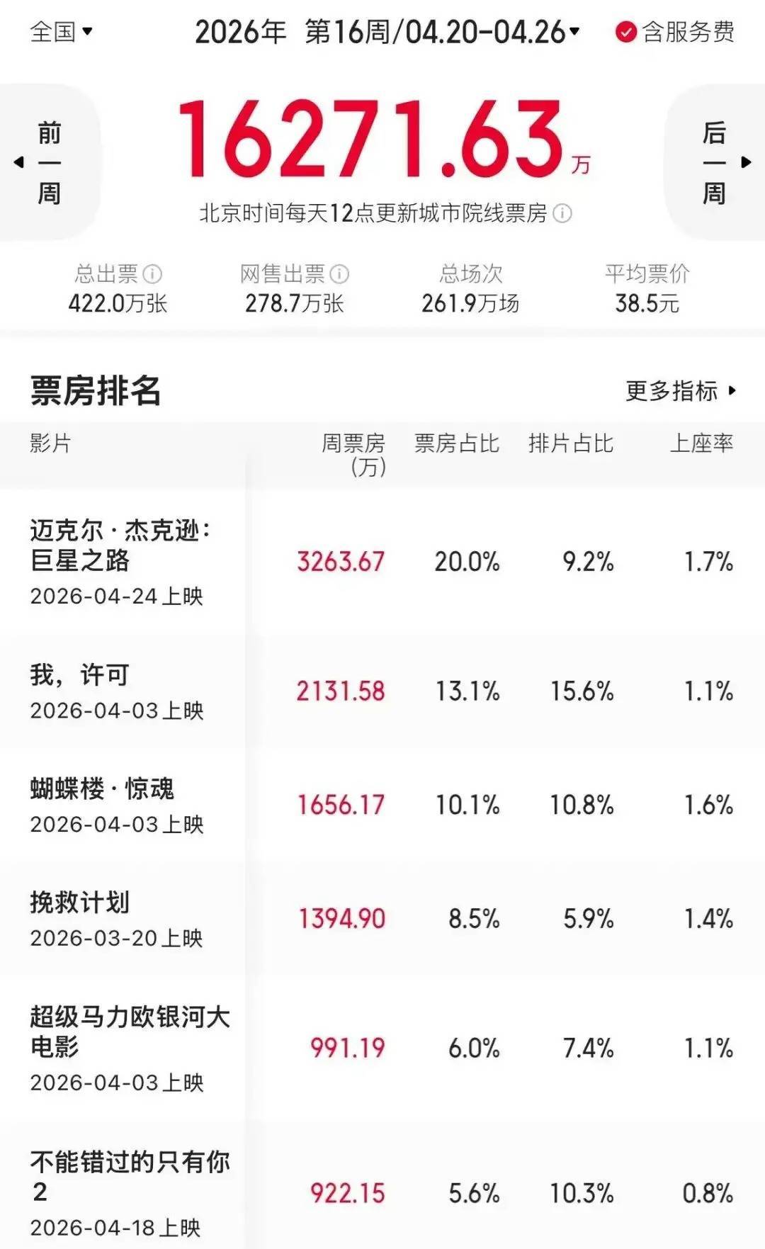 唯一一部热门院线片《迈克尔·杰克逊:巨星之路》虽然在北美票房非常亮眼,但内地票房其实也就一般般,上映首周仅万,总票房预期还不万。